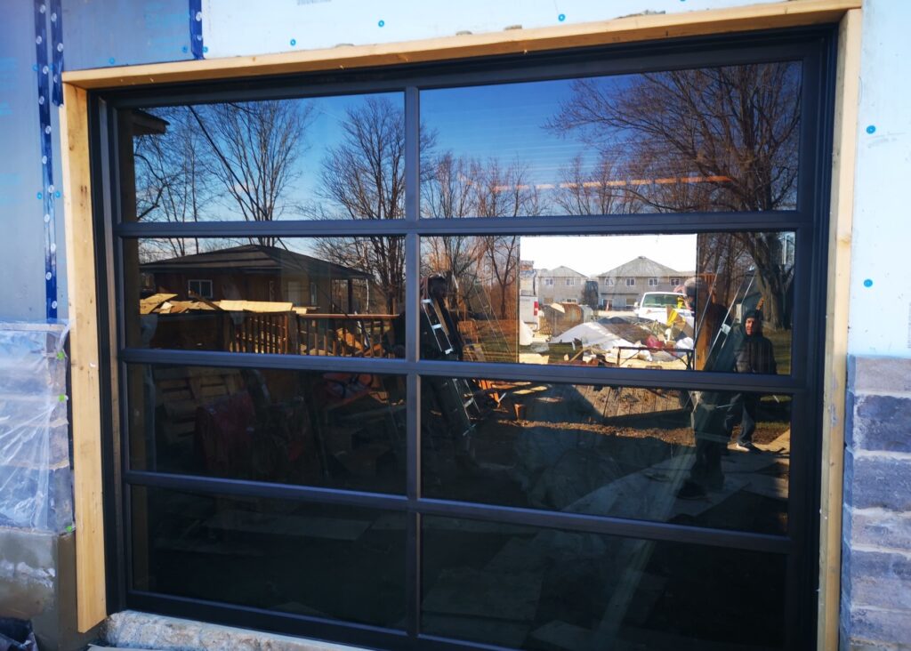 Full view garage doors with all aluminum frames and dark tinted safety glass